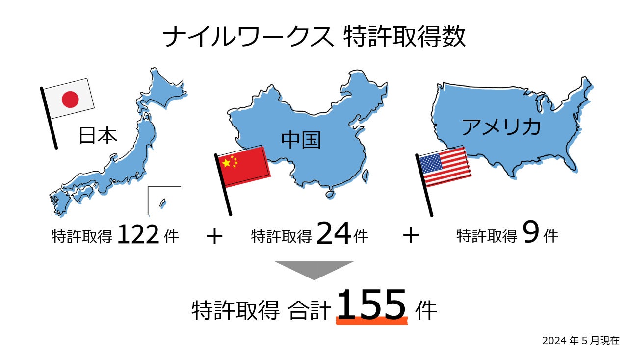 - 2024年5月現在、ナイルワークスが権利取得した特許数は155件